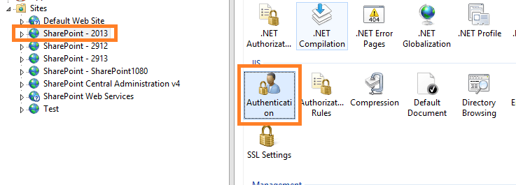 These are all enabled by default, Windows Authentication has only NTLM configured like we selected in CA. We also get a warning from having Forms Based authentication(redirect) and Windows Based(Challenge) enabled at the same time. IIS does not like this but I have managed to find out that this is ok, given certain circumstanses you need it to be this way.