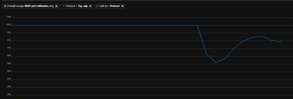 In our case, we saw that during office hours, after enough users and systems were migrated, the Firewall reached 100% in UDP SNAT utilization, causing timeouts on our DNS servers (DC’s) causing services and systems to fail.